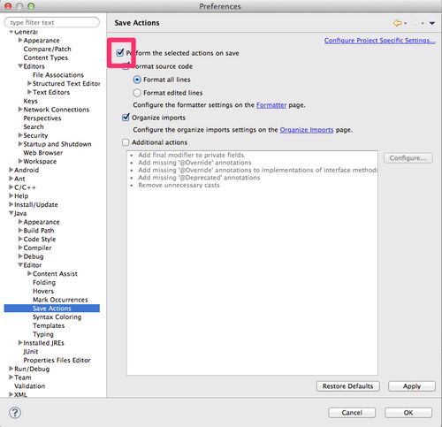 Auto Format し忘れが酷いので、Auto Auto Format にした。 ↑で Java ファイル保存時に Auto Format される。XMLもできるようにしたいんだけどないのかなあって思ったら、Android って項目で設定するとよいみたいだ。 ↑で XML ファイルも保存時に Auto Forma…